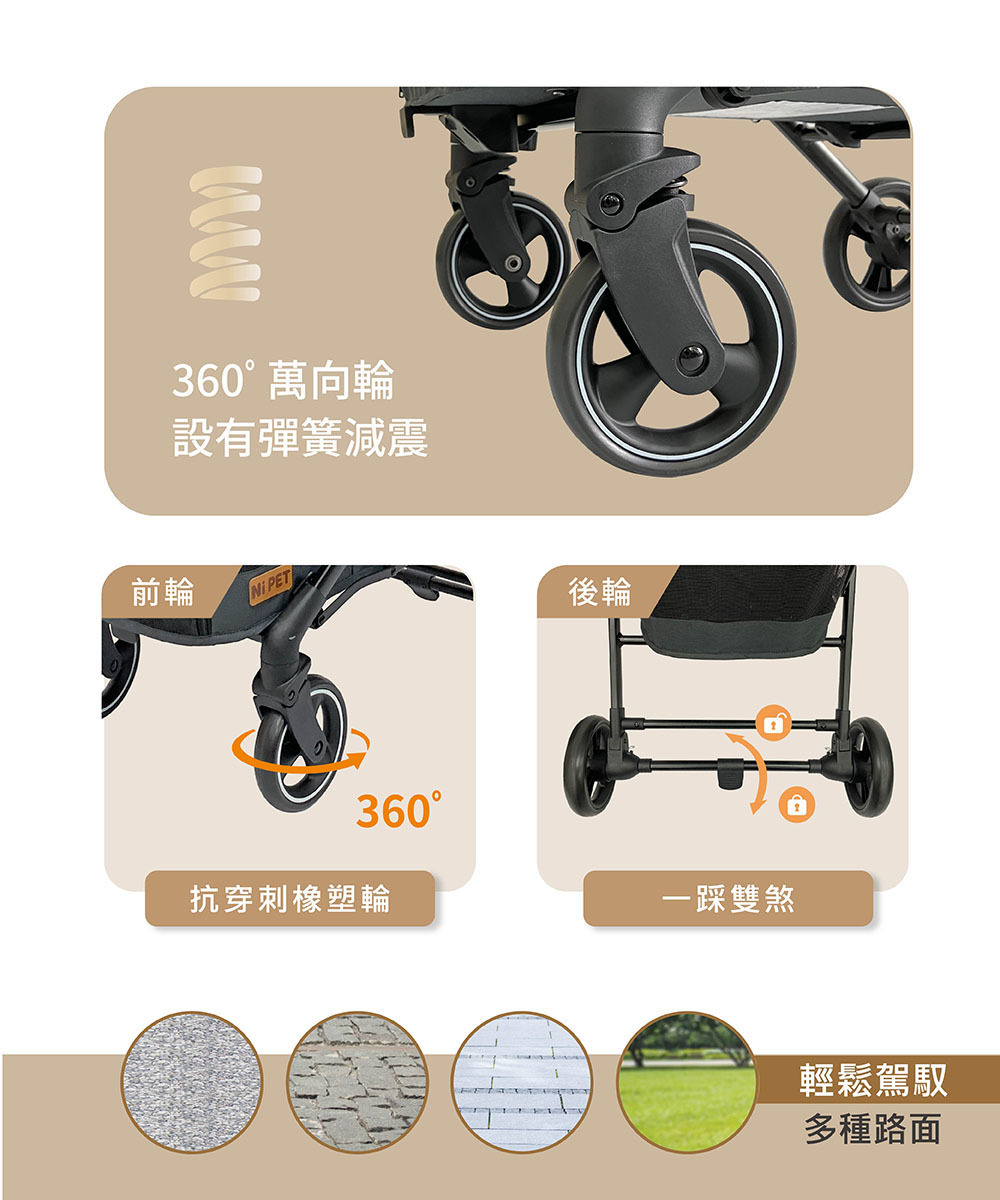 360度萬向輪,轉向靈活、推行平穩不卡頓